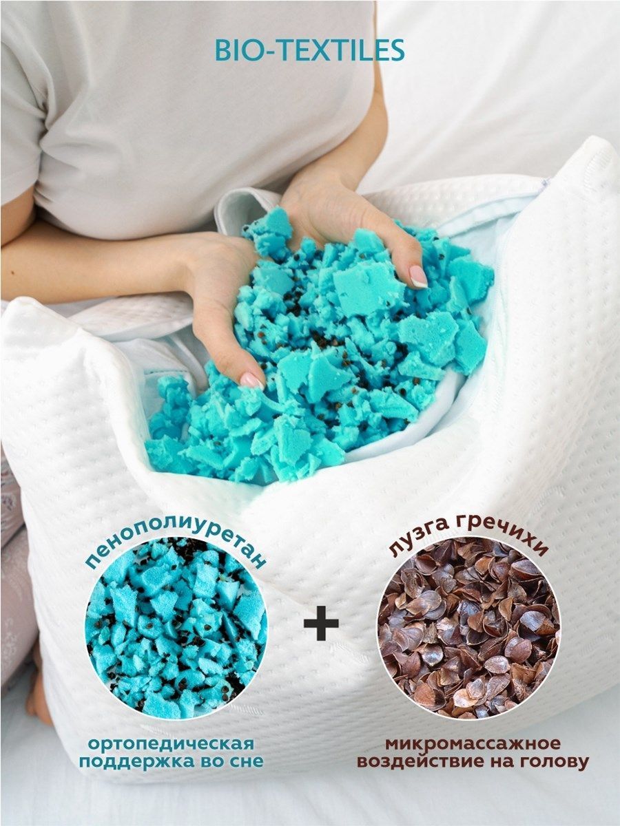 Мягкость и ортопедическая поддержка во сне достигается благодаря наполнителю из пенополиуретана, а микромассажное воздействие на кожу головы оказывает лузга гречихи.