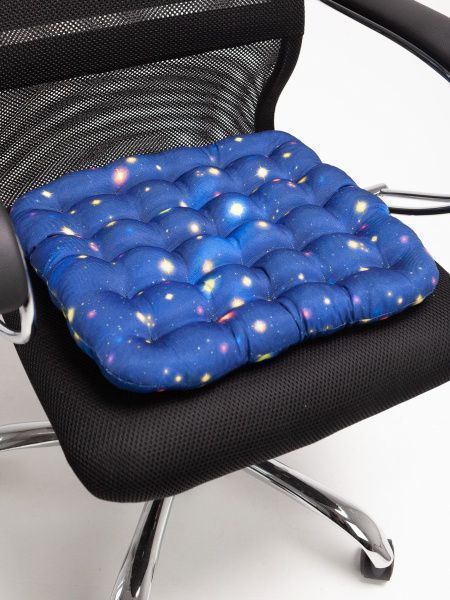 Подушка на стул в красочном дизайне создана специально для детей, преимущественно школьного возраста, так как при выполнении домашних заданий им сложно сохранять правильную осанку. Наполнитель из лузги гречихи обладает ортопедическими свойствами и придает подушке необходимую жесткость. Такая подушка за счет своей формы и особенностей наполнителя очень полезна для правильного развития опорно-двигательного аппарата, хорошего кровообращения при долгом сидении.